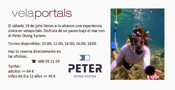 A partir del sábado 19 hasta fin de temporada, ofrecemos en nuestras instalaciones un paseo bajo el mar con el Peter Diving System. Solo tienes que llamar y reservar plaza. Anímate a probar esta experiencia única. También puedes hacer la reserva on line en el siguiente link: https://app.turitop.com/booking/box/P12/P9/en/C0/